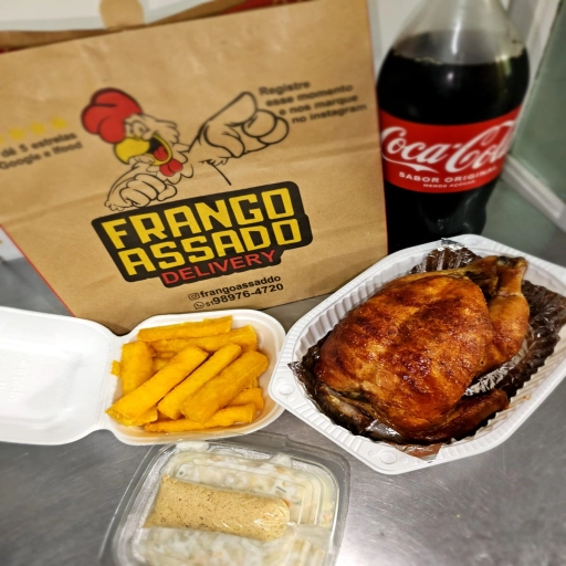 Frango assado + Farofa+ Porção de polenta + Salada de maionese + Coca-Cola 2l
